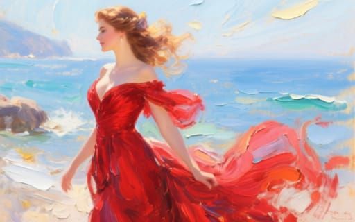 This image captures a beautiful woman in a vibrant crimson gown against a soft blue seaside. Rendered in a textured impasto style with bold brushstrokes and vivid colors, it evokes Mediterranean warmth and movement.