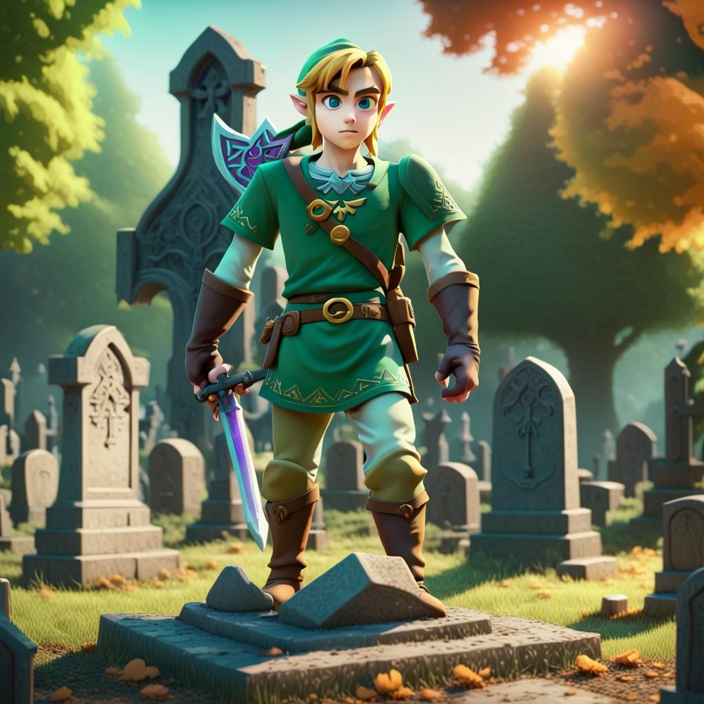 This image shows Link from The Legend of Zelda in a graveyard setting. The scene is rendered as bright and colorful 3D digital art in a cinematic style.