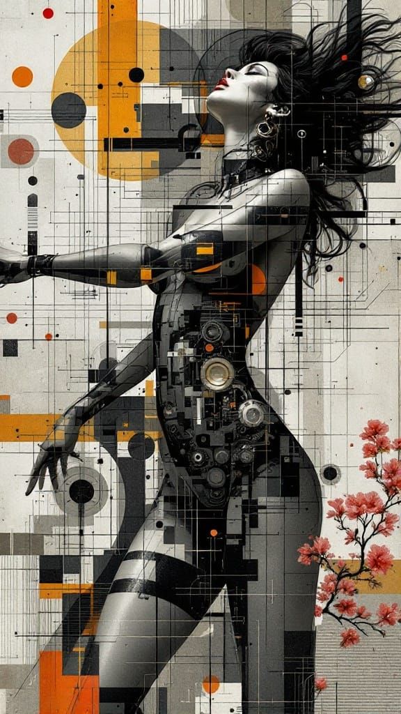 This image combines industrial precision with vibrant cherry blossoms, blending geometric patterns and a retro-inspired garden scene with a fusion of mechanical and organic elements.