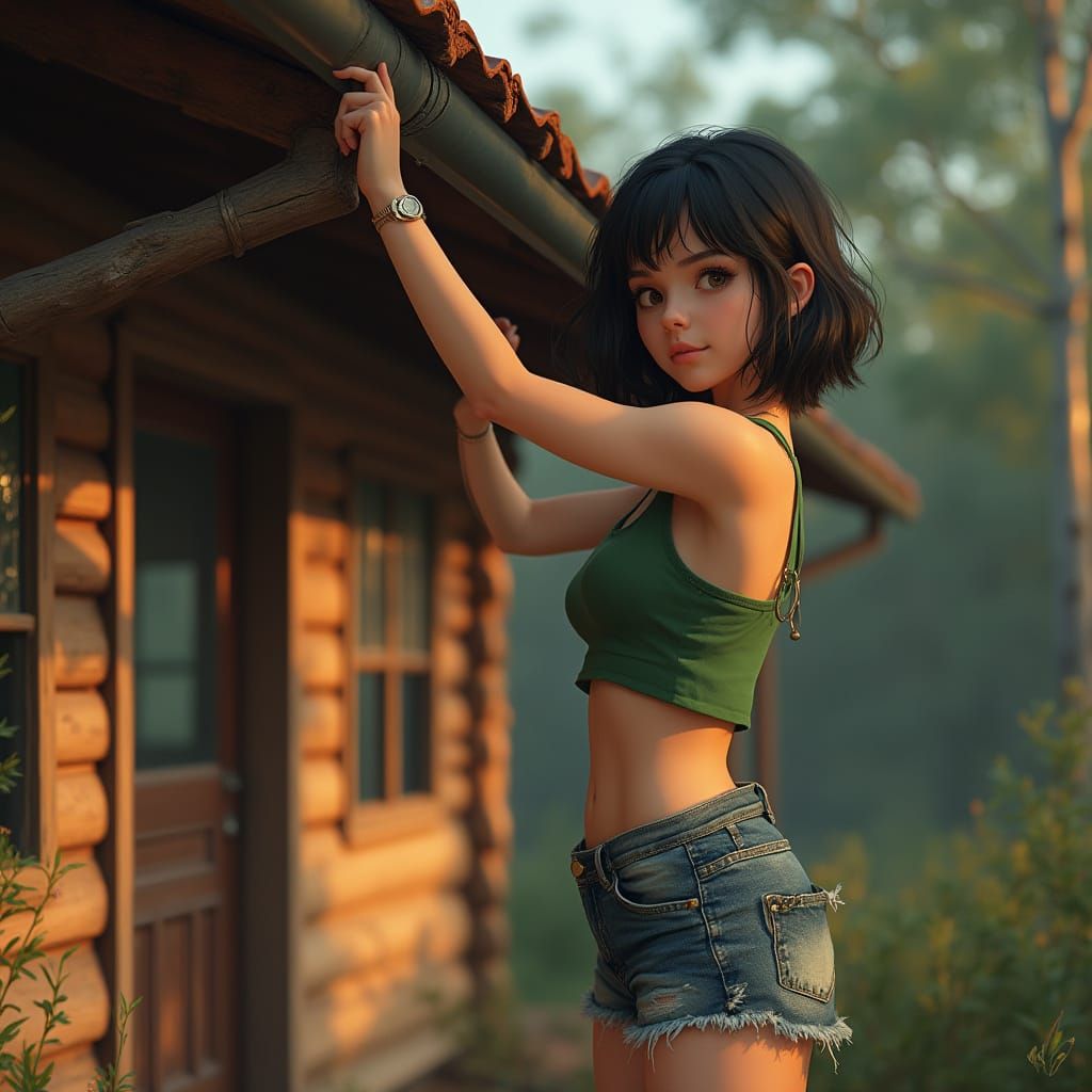 A hyperrealistic image of a 19-year-old woman with black hair and dark eyes cleaning the gutters of a cabin at dusk. The image has meticulous details and subtle textures, as digital art.
