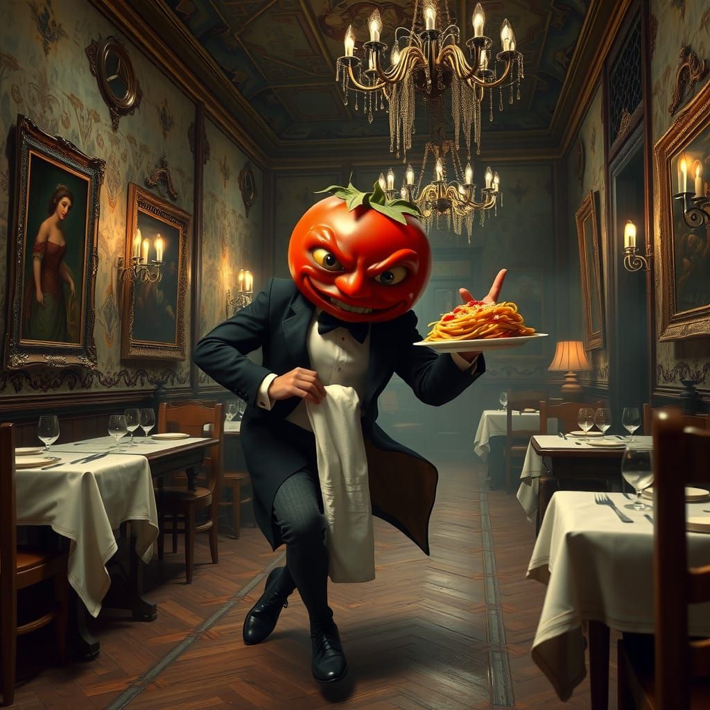 A haunting image of a tomato-like waiter in a dimly lit, ornate French tavern from 1878, surrounded by bizarre oil paintings and cobweb-covered chandeliers, with a twisted, macabre grin as he serves spaghetti.