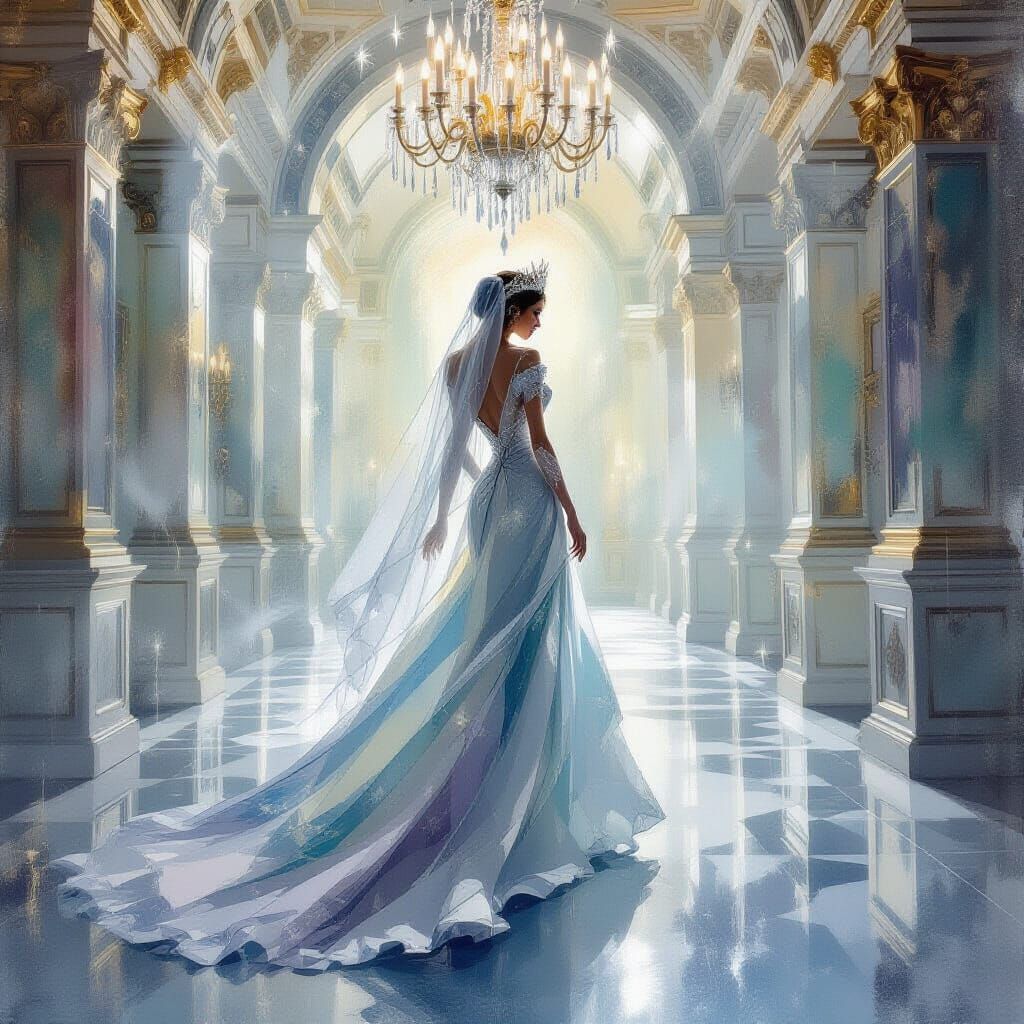 This maximalist impressionist artwork features a spectral queen in a misty ballroom, rendered with thick impasto brushstrokes in muted pastels, silver, and gold, evoking lost grandeur.