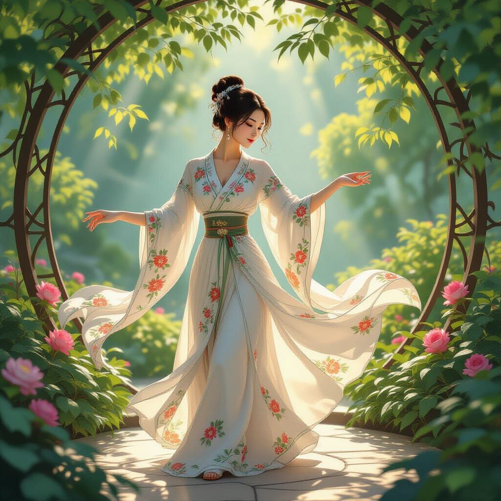 This image depicts a graceful young woman in an art nouveau dress performing qigong in a sun-dappled garden. Rendered in a flowing Jugendstil aesthetic with organic lines and soft, ethereal light.