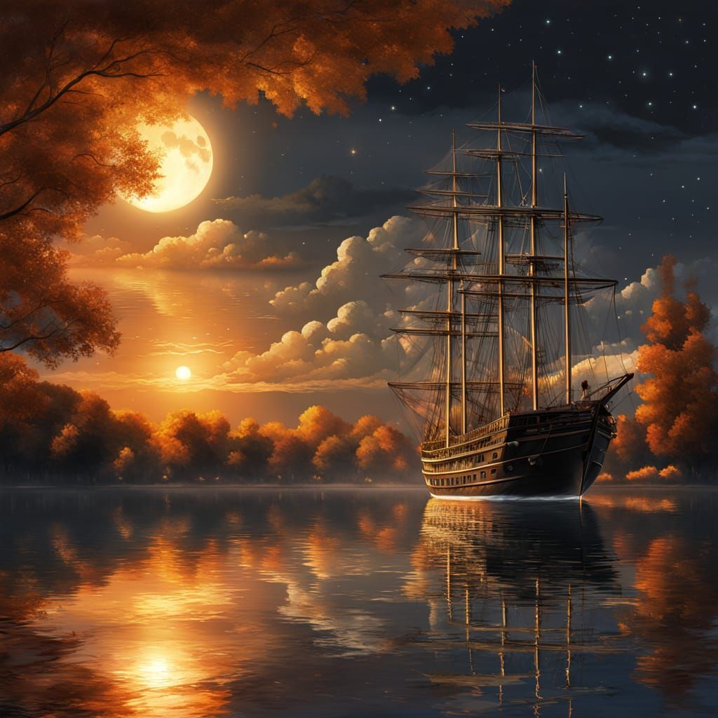 A vibrant digital painting of a large ship sailing on a serene lake at night. The ship has luminous sails, and the scene is illuminated by a glowing moon with reflections on the water.