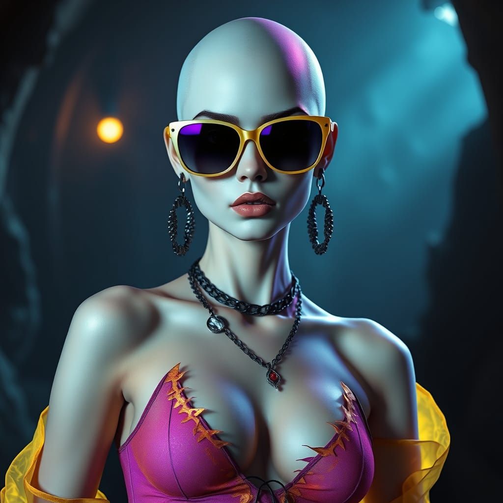 A striking picture of a slim, bald woman with large sunglasses in a tattered dress, set in a dark fantasy world. The image features hyperdetailed textures, vibrant colors, and dynamic lighting, rendered as 8k digital art.