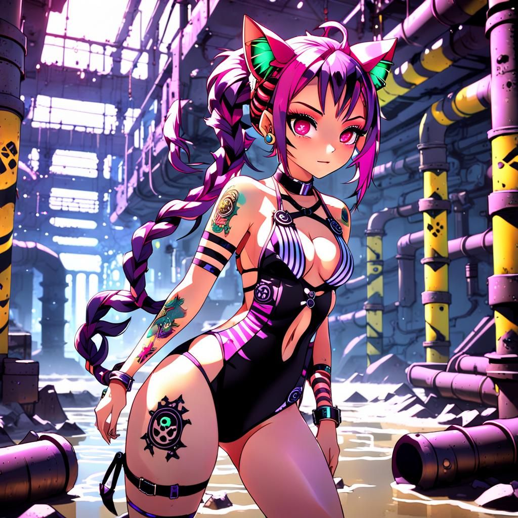 A vivid image of a playful anime-style cyborg girl with purple hair on a futuristic beach. She has glowing tattoos and wears a bold swimsuit amidst eerie, abandoned scenery, rendered with high detail.