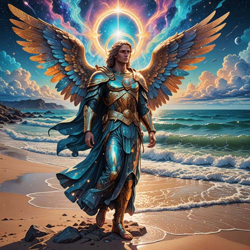 A vibrant, high-resolution image of an archangel on a beach. The illustration blends astral and cosmic elements in a holographic style reminiscent of mixed media art.