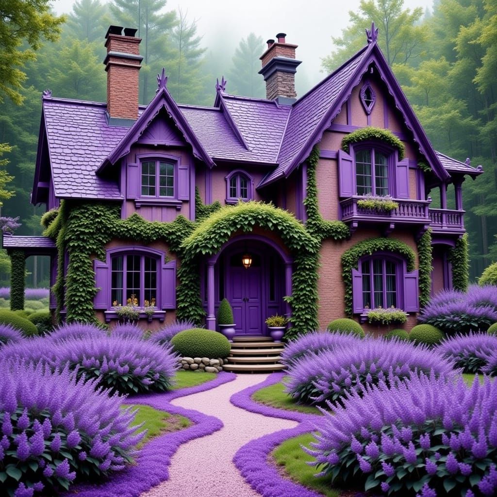 All purple vibrant photograph of a whimsical, purple-hued cottage nestled in a lush lavender garden. The purple house, with its steep roof, wooden beams, and ivy-covered facade, exudes a fairytale charm. The exterior walls are painted a rich, royal purple, complemented by purple hydrangeas and other ...