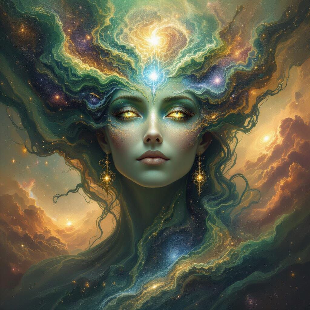 This image depicts Gaia-Theos, a luminous entity representing primordial earth, formed from swirling nebulae of greens, browns, and blues. Her eyes are galaxies, and she is adorned with constellations, evoking awe and wonder.