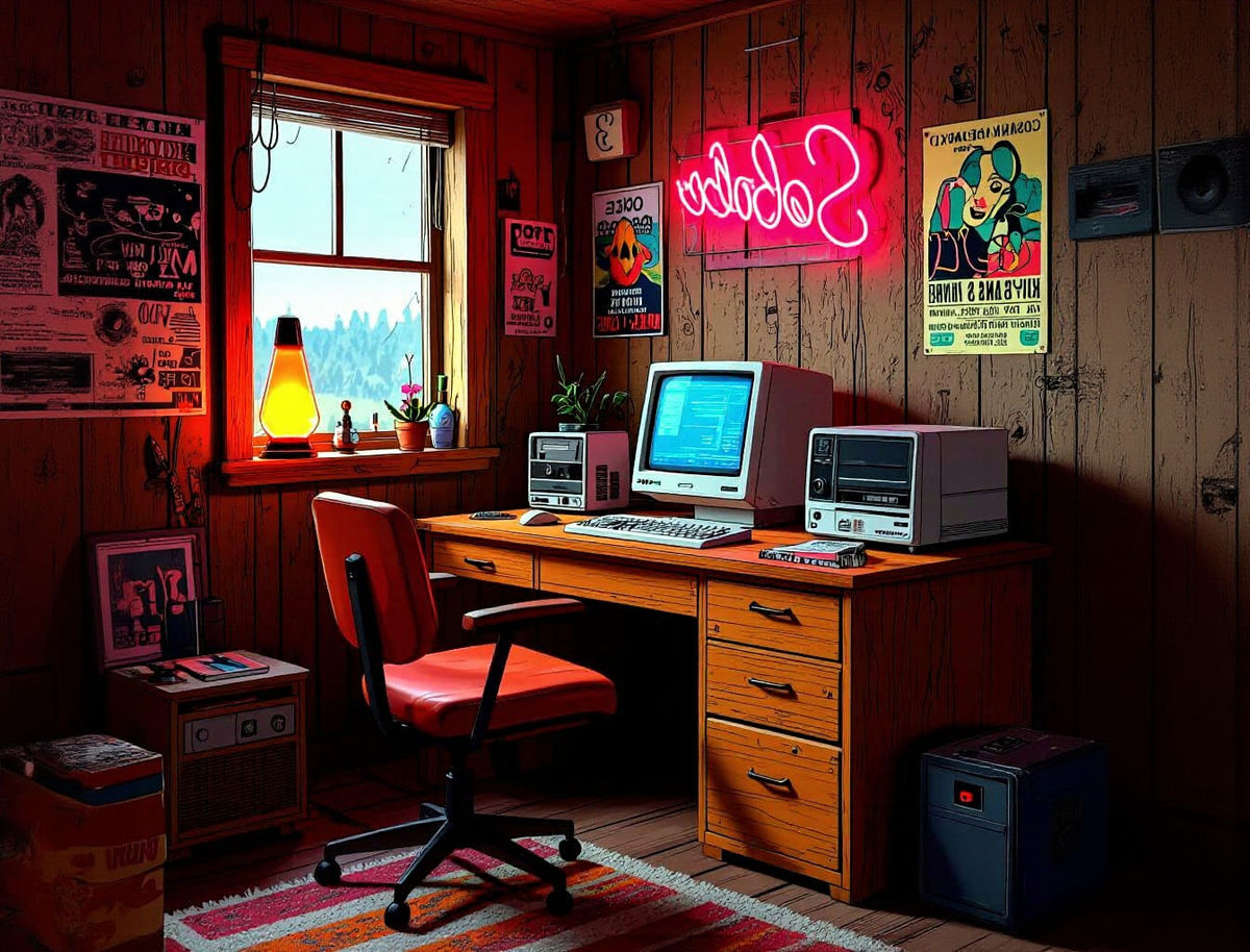 This image shows a simple, rustic 90s-style gamer's bedroom in a lofi art style. The room features a bed, wooden desk with a computer, chair, window, and possible neon sign.
