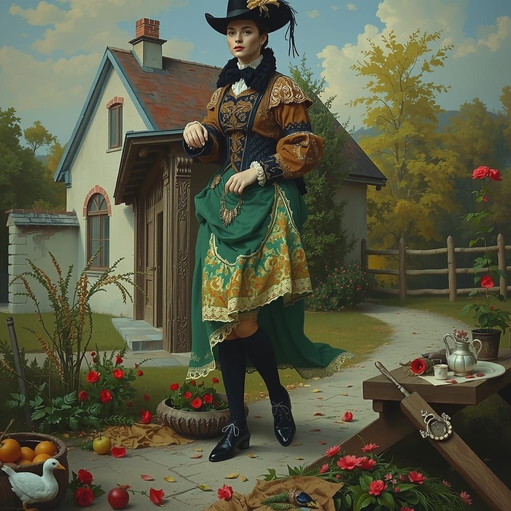 A figure in vintage clothing stands in the French countryside. Soft light and intricate details give the image a romantic, rococo art style.