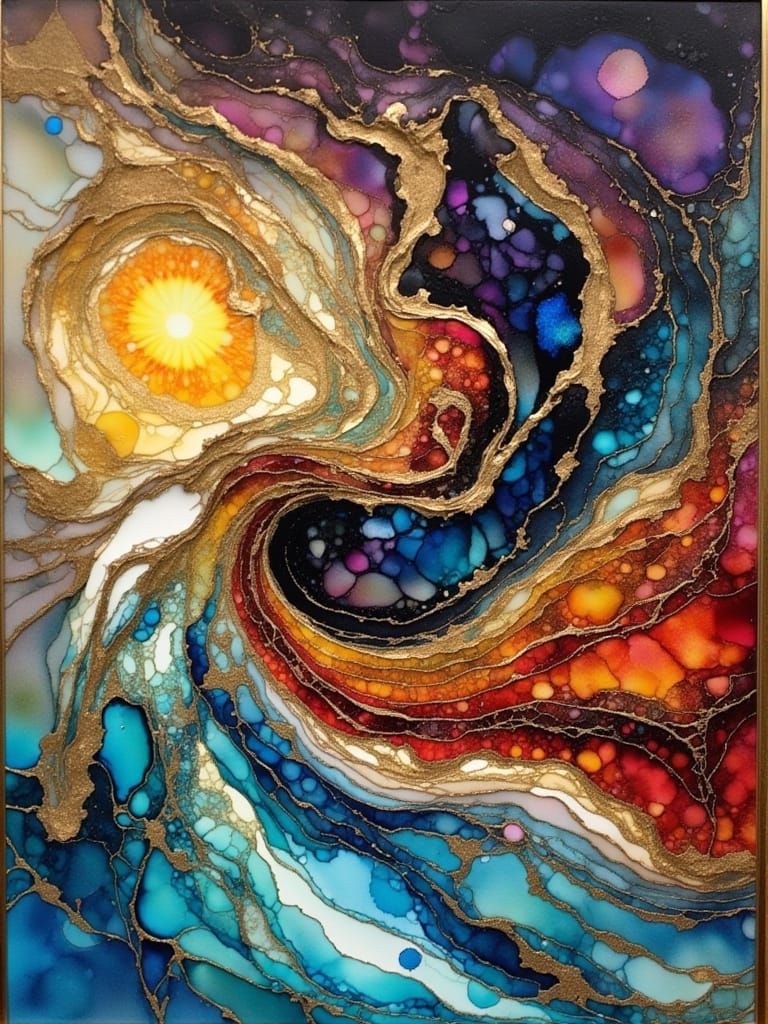 golden velvet Happy Things breaking rules of geometry petri effect in silverpoint resin subtly shifting lighting alchemical anastrophe enclosed recursive alcohol ink background egress window the concept of neverness manic happens fountainfall <lora:Neurographic Flux:1.0> <lora:Alcohol Inks Flux:1.0> ...