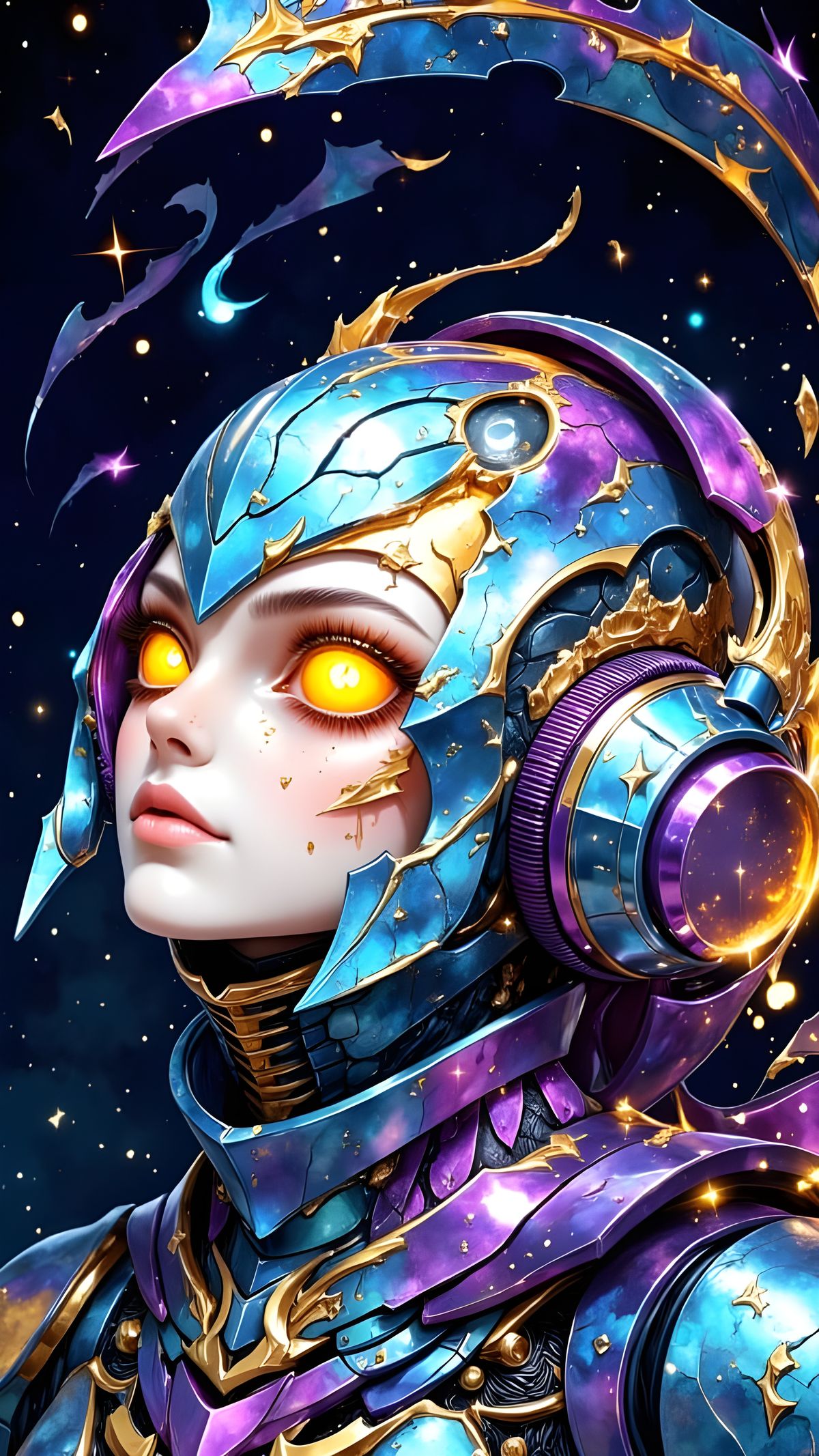 A hyperdetailed image of an anime knight with glowing yellow eyes wearing a unique helmet with headphones. This digital artwork showcases a vibrant anime aesthetic.