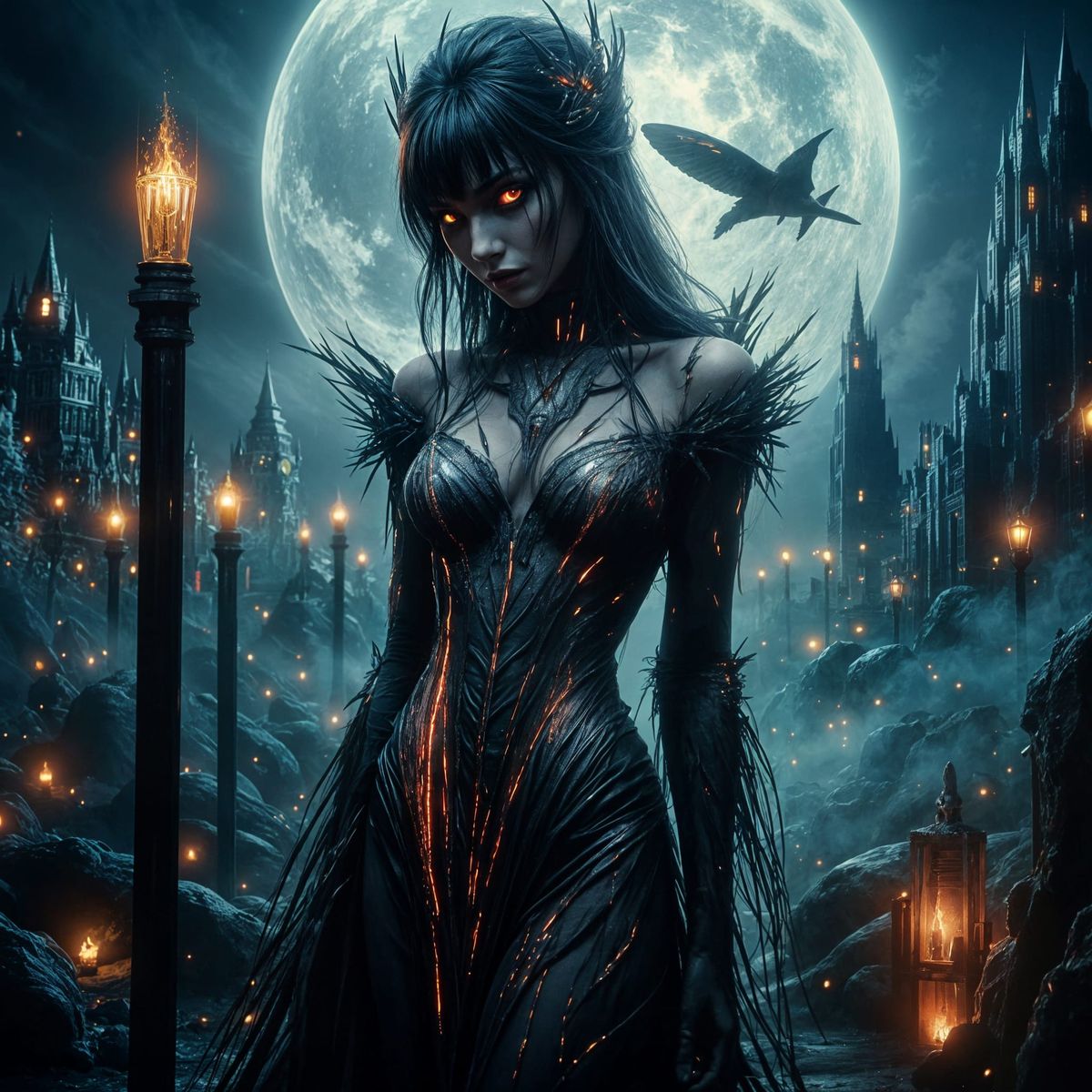 A hyper-realistic digital painting of a female vampire in flapper dress, surrounded by eerie elements in a moonlit, mist-filled castle setting. Features deep reds, golds, and blues with intricate textures.