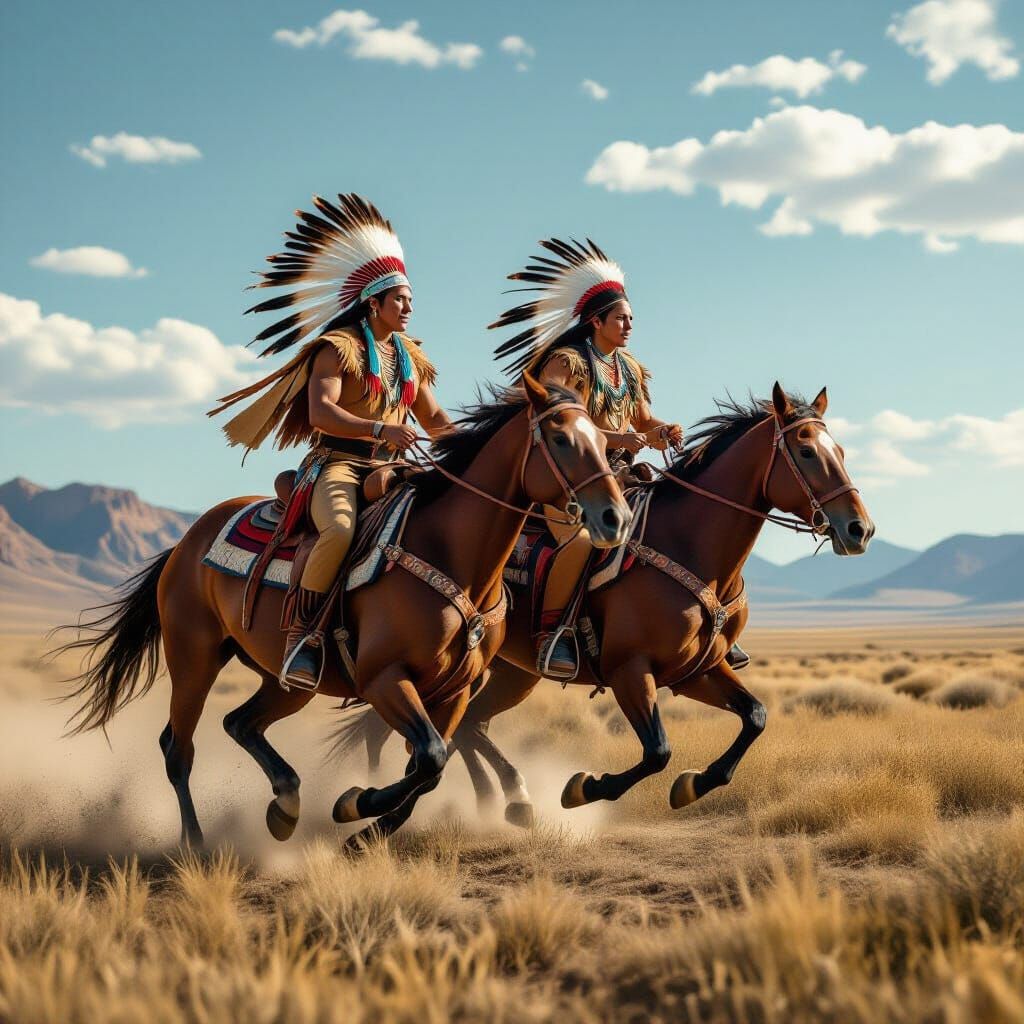Create your own images of Native Americans riding horses across the plains. It's free and easy with our AI image generator!
