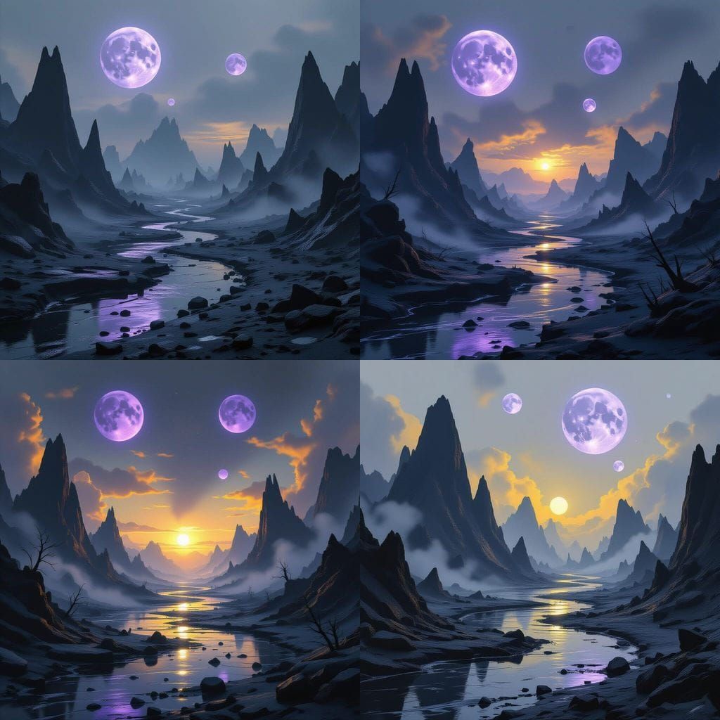 A desolate alien landscape featuring claw-like mountains and black rivers under a grey sky. Shattered moons and a faint purple glow accentuate the gothic, cinematic atmosphere of cosmic desolation.