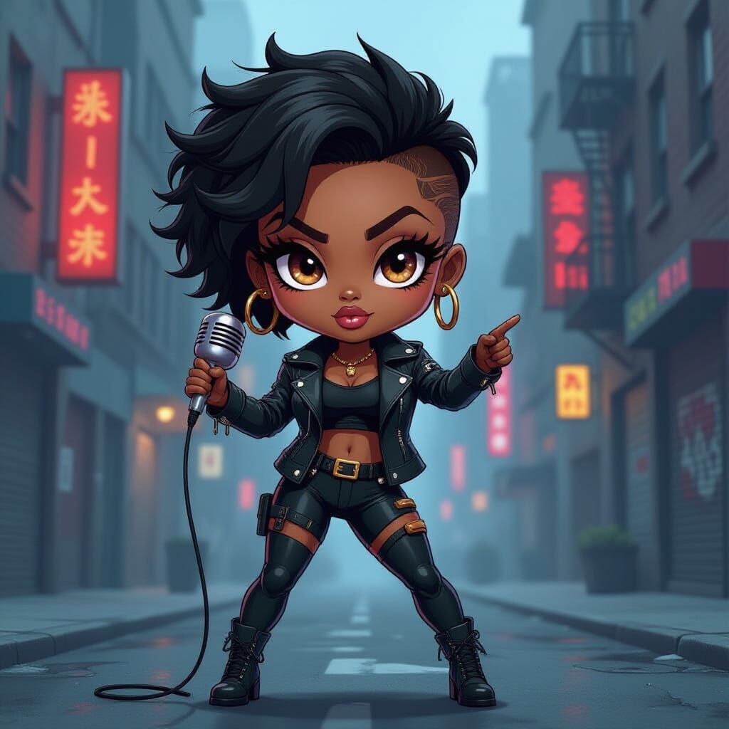 This striking image shows a stylized chibi character, an African-American woman in a leather jacket and leggings, posing with a microphone. The scene is set against a surreal-brutalist Brooklyn backdrop with noir lighting, evoking comic art and surrealism.