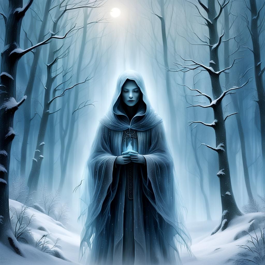 A ghostly figure stands in a snow-covered forest, surrounded by softly glowing mist. This ethereal digital painting features delicate brushstrokes and icy blue hues with pale silver accents, creating a hauntingly beautiful, eerie landscape.