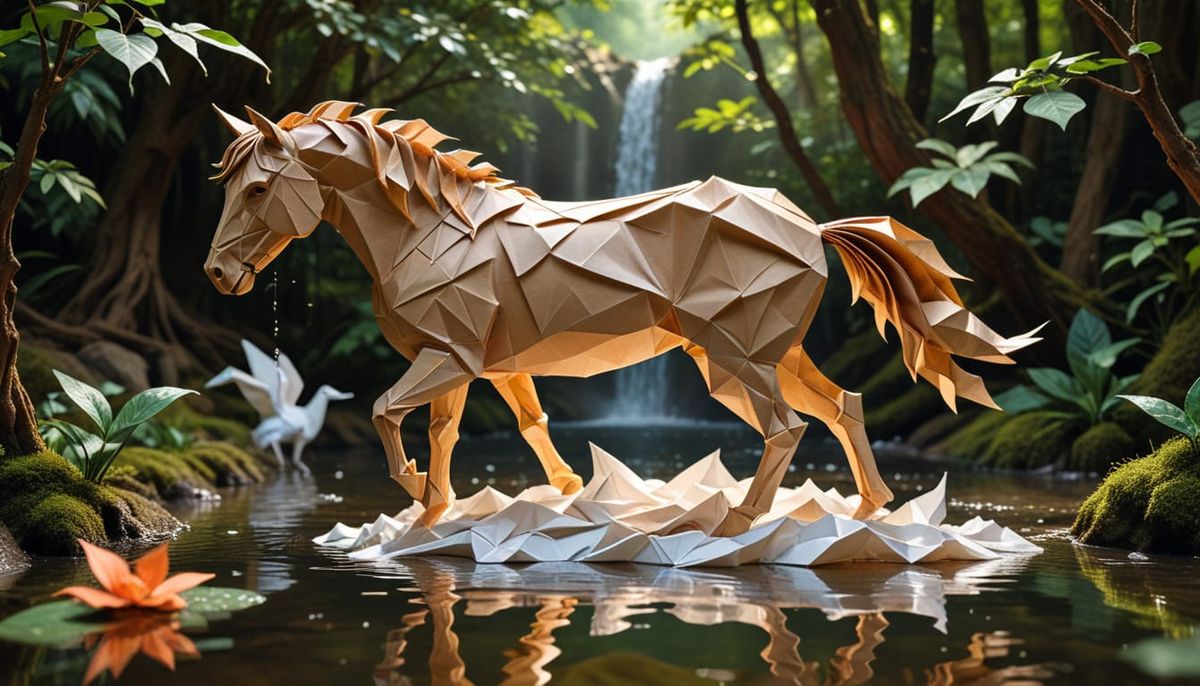 Um mundo feito inteiramente de origami. Nas profundezas de uma floresta exuberante, um majestoso cavalo de origami, feito de papel pardo, abaixa a cabeça para beber água de um...