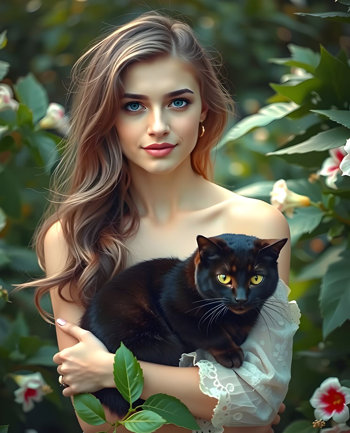 Stunning! Her sapphire eyes shimmer like the ocean at dawn as she cradles her beloved cat, their souls entwined in a quiet melody of love and devotion.( with "" Sra Gata "")
