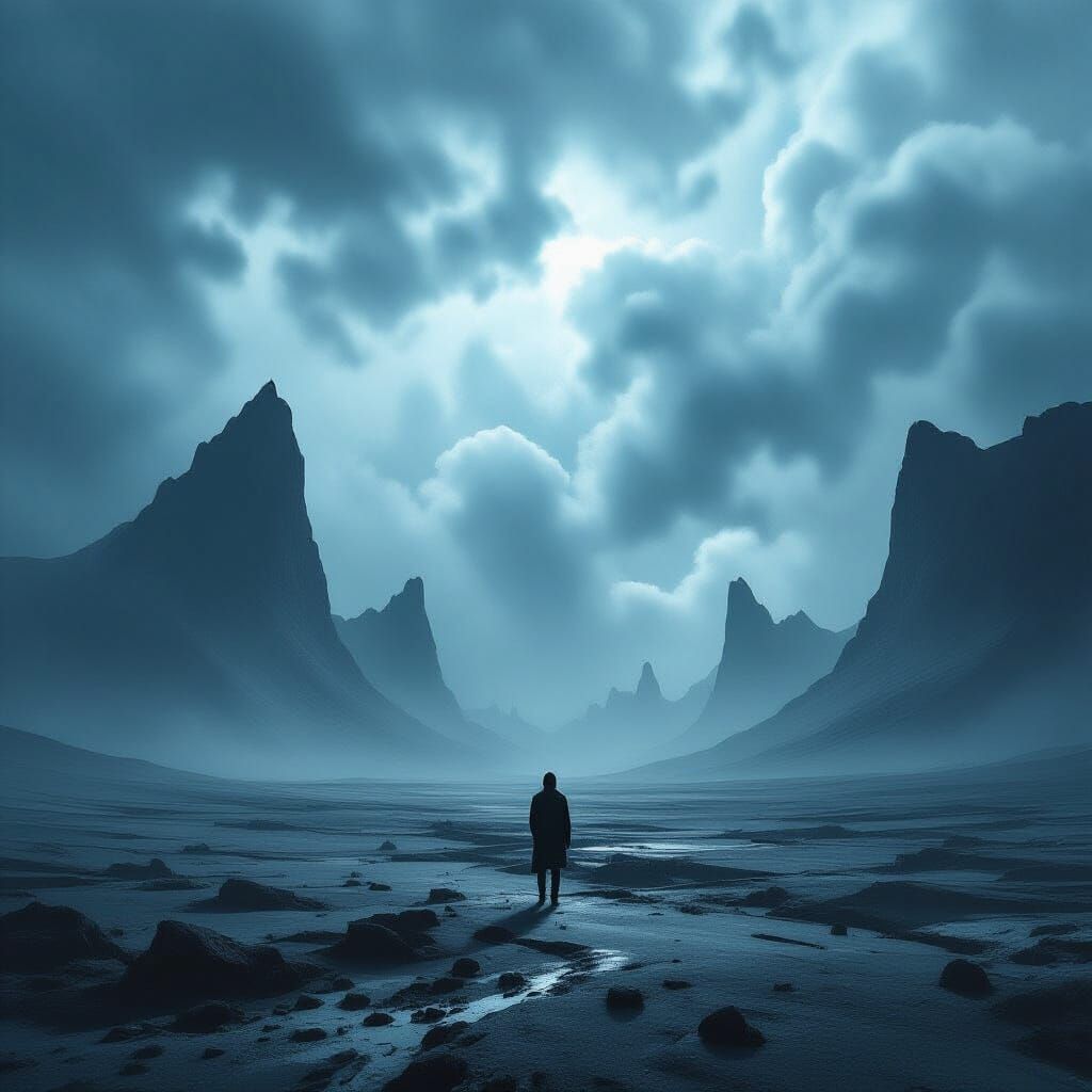 This image depicts a desolate, barren landscape under a stormy sky, evoking psychological tension. Jagged shapes and a lone figure are rendered in a dramatic, high-contrast photorealistic style with a desaturated color palette.
