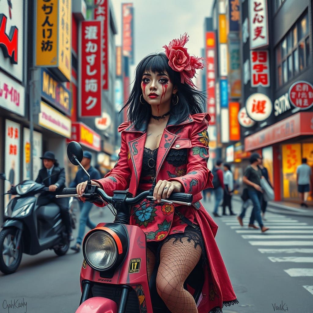 A striking picture of a Yami Kawaii woman on an e-scooter in Osaka. The image blends horror-inspired makeup with a vibrant pop art style, set against a surreal, geometrically patterned backdrop.
