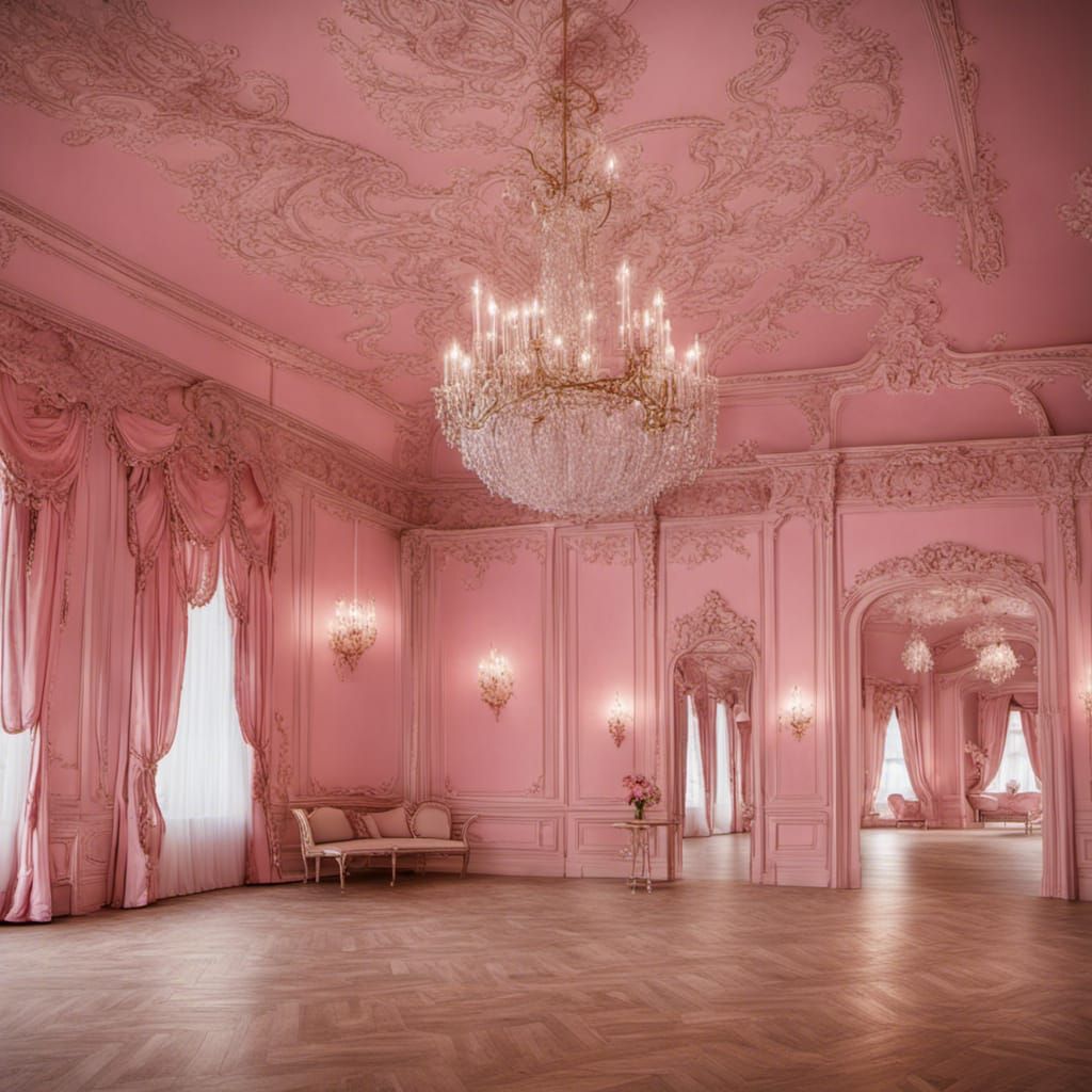 A striking picture of a Rococo ballroom with pink walls. The ornate chandelier illuminates the dance room in a display of opulence and classical architecture.