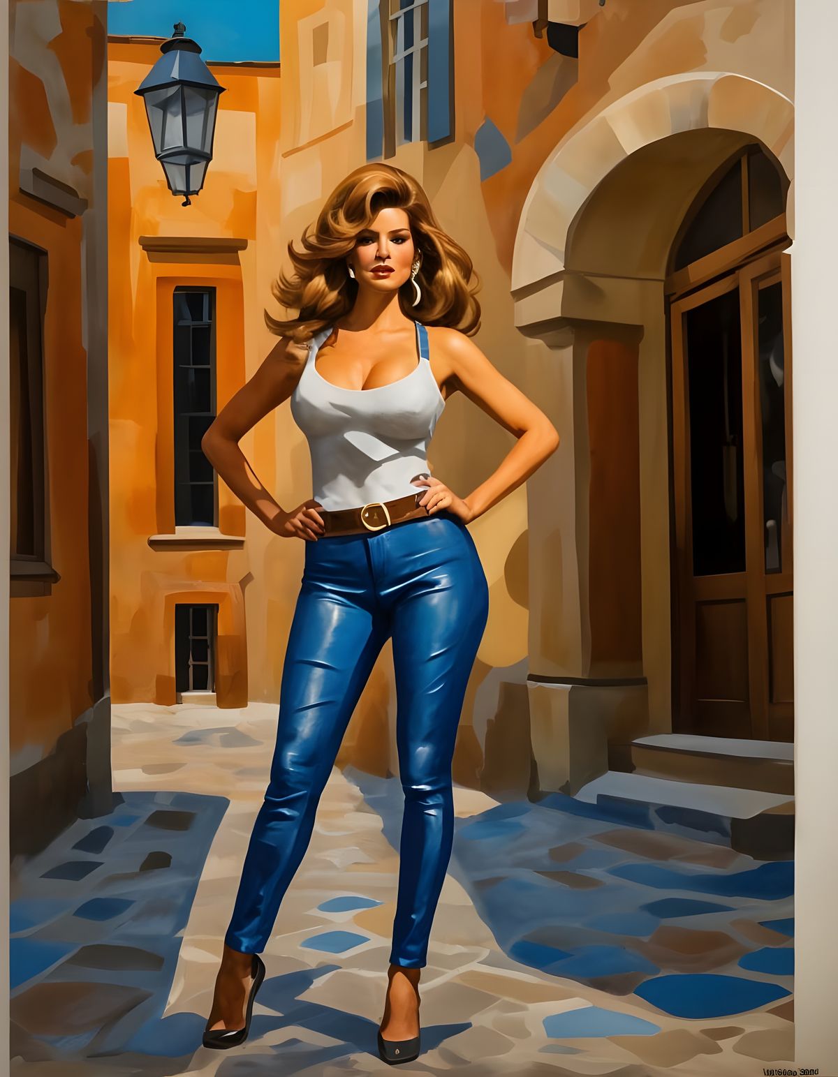 A vibrant abstract expressionist painting of a woman with brunette hair standing in a village square at sunset. The oil on canvas artwork features heavy impasto textures and layers of paint.