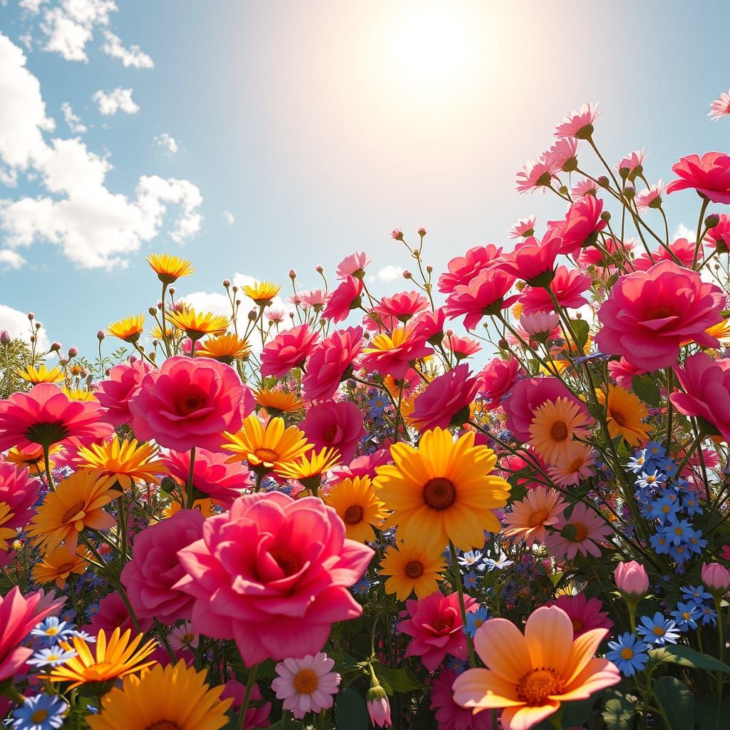 This stunning 3D rendered image depicts a lush garden filled with an array of colorful flowers, dancing gently in the breeze under a brilliant, cloudless sky. With intricate textures and subtle shading, this futuristic floral scene exudes serenity and tranquility, blending organic and futuristic elements...