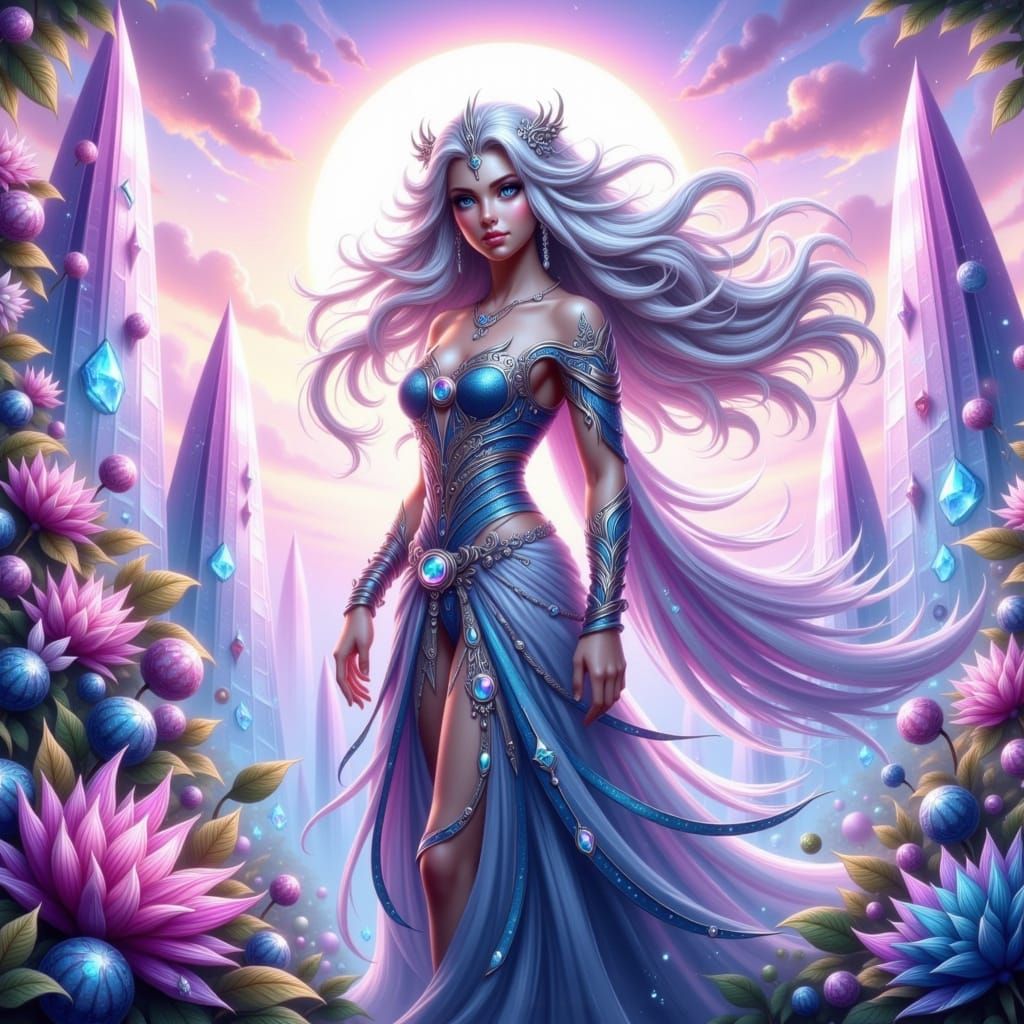A captivating young cultivator stands proudly in a fantastical realm, surrounded by shimmering foliage and glowing crystal formations, set against a breathtaking ombre sky. This enchanting digital art piece showcases intricate textures and a rich color palette, evoking a sense of magic and wonder.