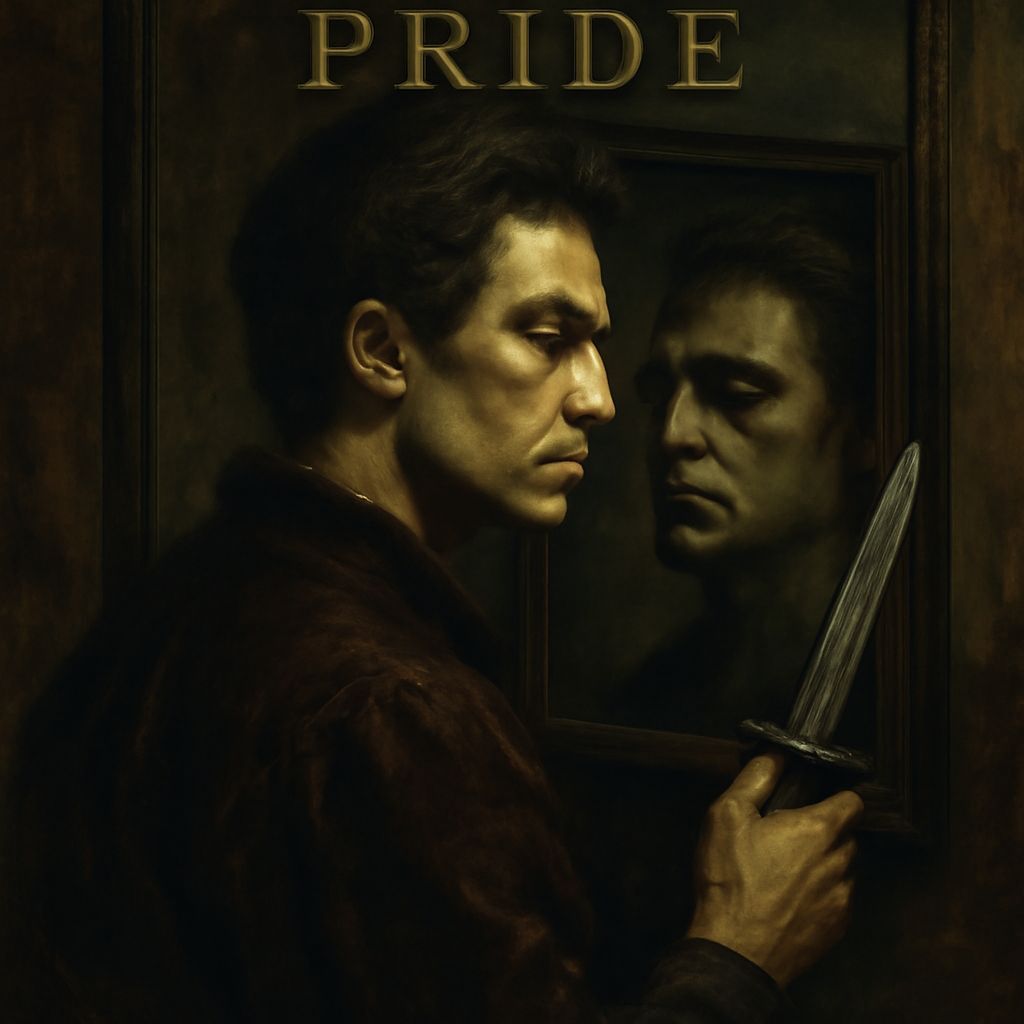 This AI-generated image visualizes the concept of 'Pride,' depicting a figure consumed by self-importance and inner darkness, blinded by their own ego.