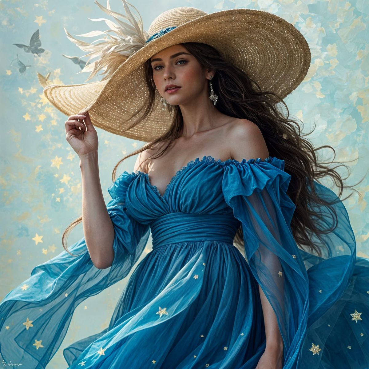A serene image of a woman in a flowing blue dress and hat. The artwork captures an ethereal, magical quality with impressionistic and impasto elements.