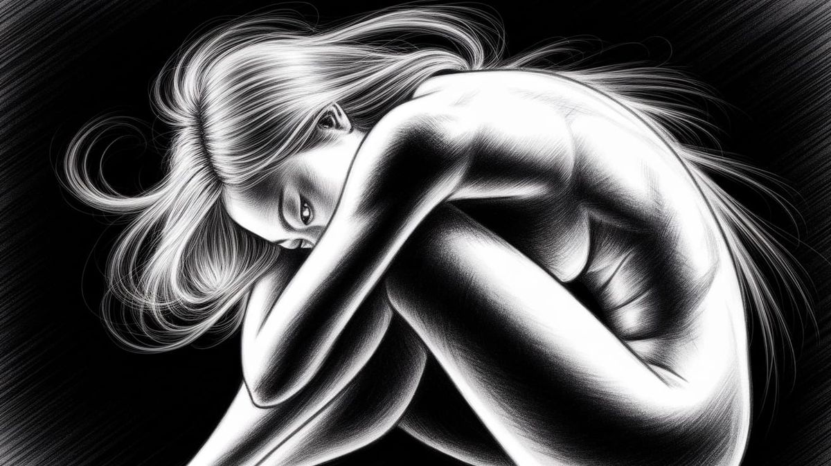 A striking pencil and graphite sketch of an East Asian woman in a fetal pose, rendered with flowing hair textures and dramatic, high-contrast lighting that emphasizes her form against deep shadows. Ethereal and emotive.