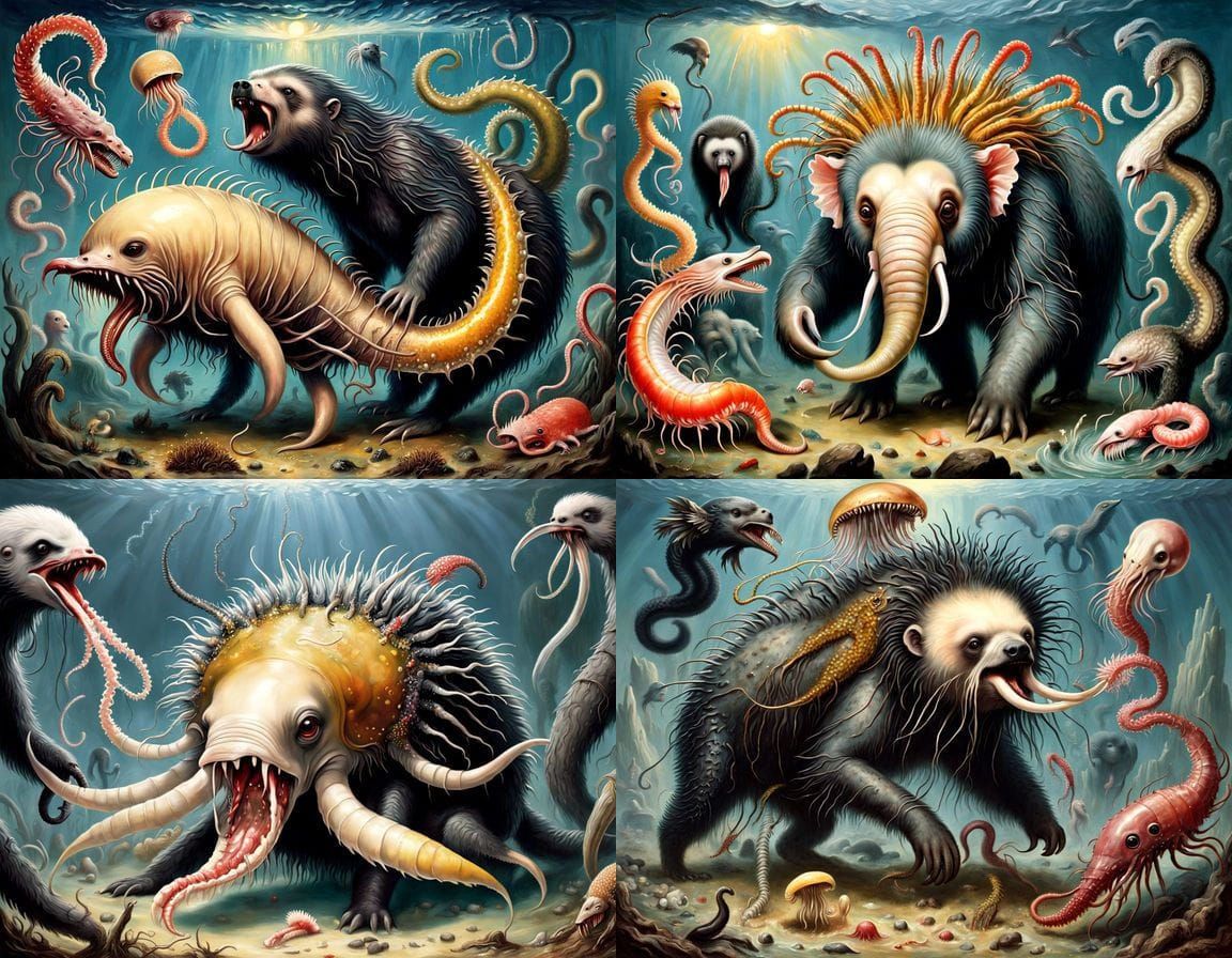 This image shows a twisted, nightmarish landscape inspired by the Romantic style of Turner, Dali, and Tapies, featuring a grotesque fusion of African wildlife and marine life.