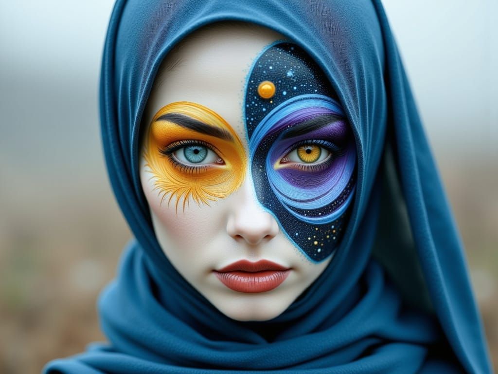 A striking portrait of a woman with a sun eye and a galaxy eye, set against a misty grey background. Rendered in vivid blue, yellow, and violet tones with hyper-realistic detail.