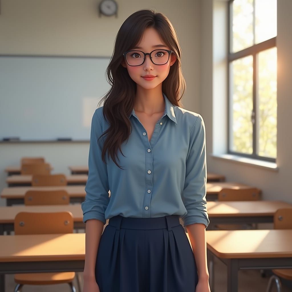 This image shows a hyper-realistic portrait of a young woman with dark hair and glasses in a classroom setting. The artwork emphasizes fine details and textures.