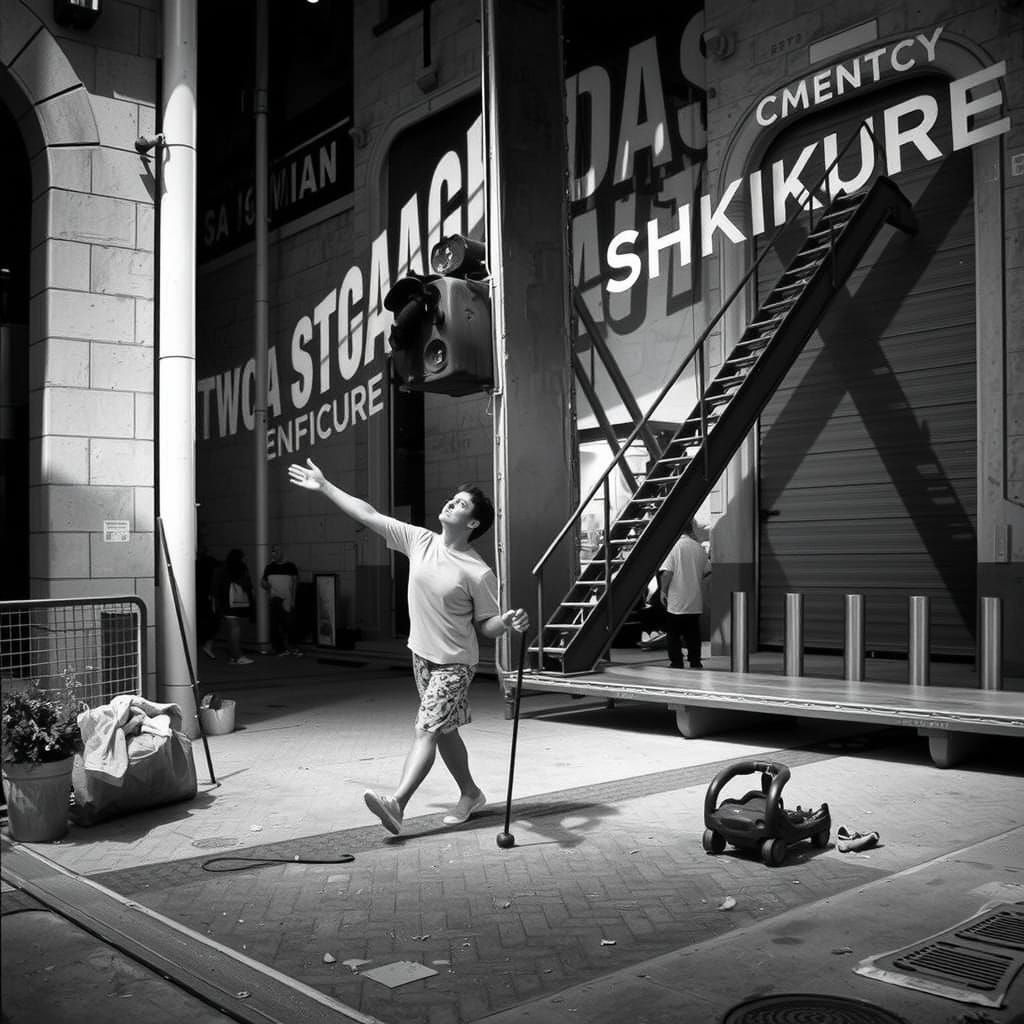 This image captures an urban installation in a public space, rendered in a photorealistic black and white style. It highlights clean lines, geometric shapes, and dramatic shadows, emphasizing textures and negative space.