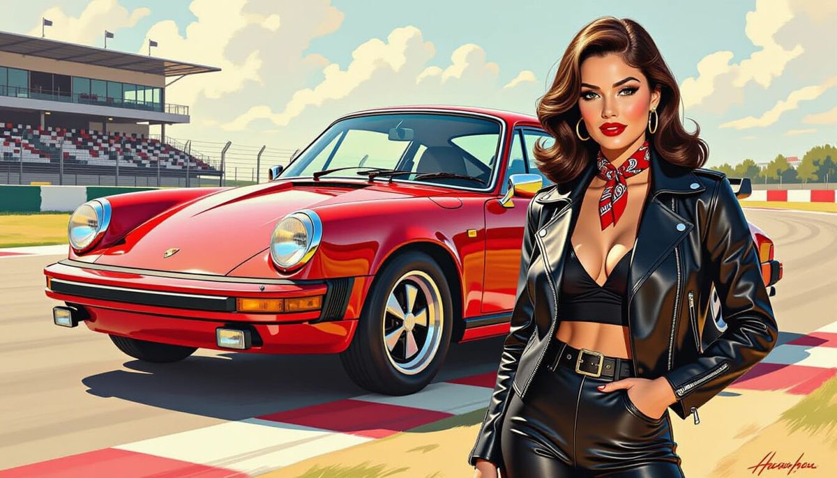 This image showcases a glamorous 1970s pinup model in a leather biker jacket posing with a vibrant red Porsche 911. Rendered as an impasto painting, it captures vintage motorsport energy with bold textures and dramatic lighting.
