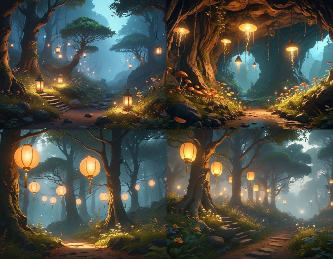 This image shows an underground cavern illuminated by hanging lanterns, where a hidden forest flourishes. The artwork is rendered in a detailed, ethereal style, reminiscent of 3D anime art.
