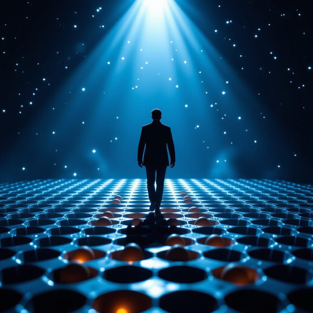 This image captures a suspenseful scene of a figure cautiously crossing an egg tray over a starry abyss, rendered in a dramatic, high-contrast film noir style with deep shadows and stark lighting.