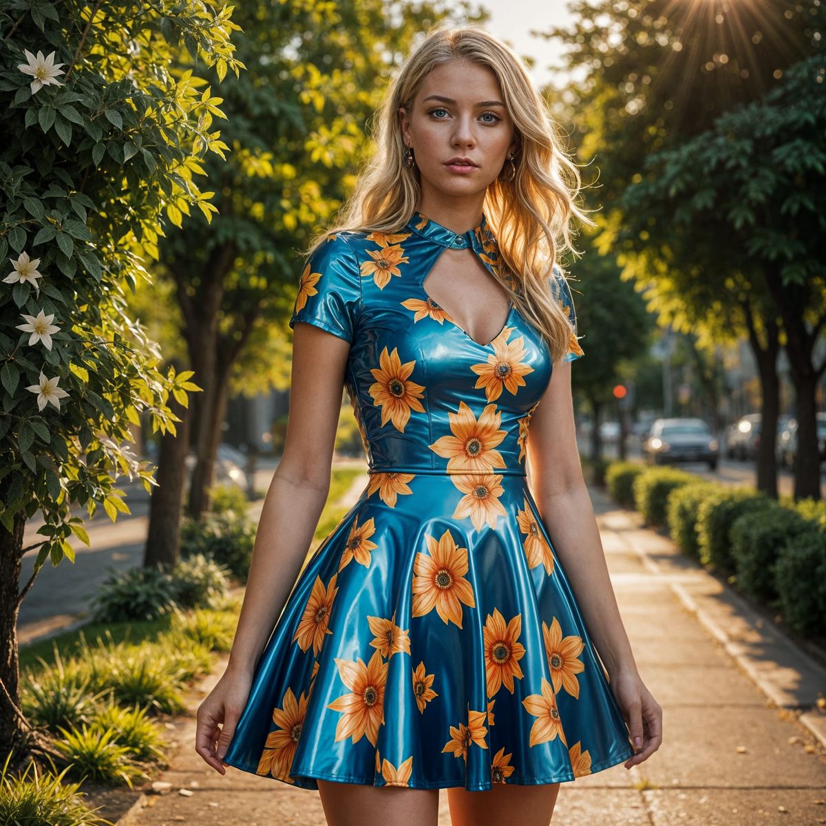 This image shows a statuesque blonde woman in a floral latex dress. The full body shot emphasizes cinematic realism, vivid colors, and detailed textures under golden hour sunlight.