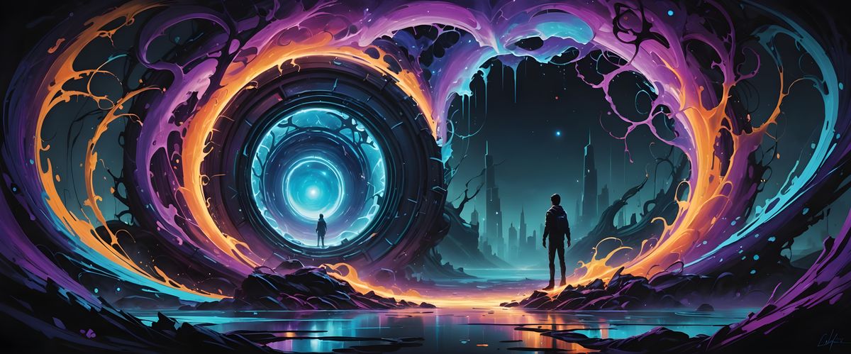 This image shows a time travel portal glowing with bioluminescent colors. Swirling, opalescent light surrounds the gateway in a colorful, ultra-detailed graffiti art style.