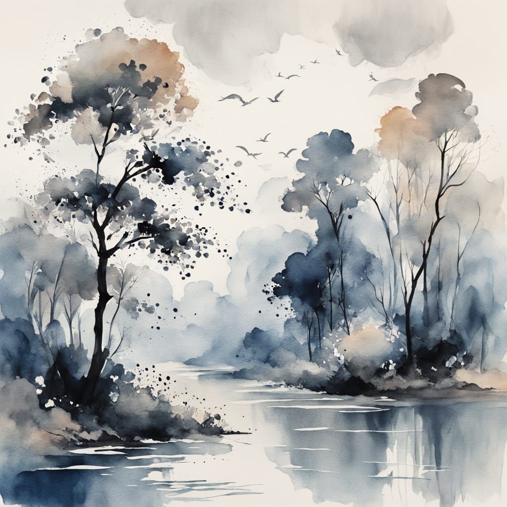 This dreamy painting captures the gentle sway of black trees in a soft, white breeze. Characterized by loose brushstrokes and muted colors, it evokes a soothing atmosphere reminiscent of Impressionist masters.