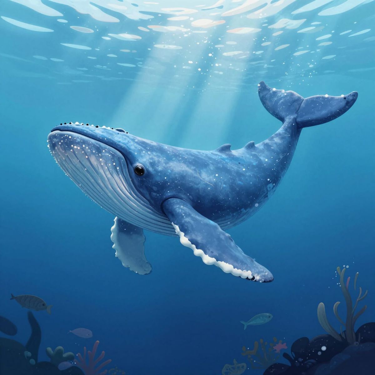 This image depicts a large, charming blue whale swimming in a deep sapphire ocean. Sunlight streams from above, creating ethereal light rays. The art style is whimsical and illustrative, evoking a sense of wonder.