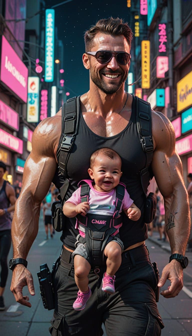 This image shows a muscular man in a cyberpunk city jogging with a baby in a carrier. Neon lights illuminate a starry night as the happy baby enjoys the ride in this futuristic scene.