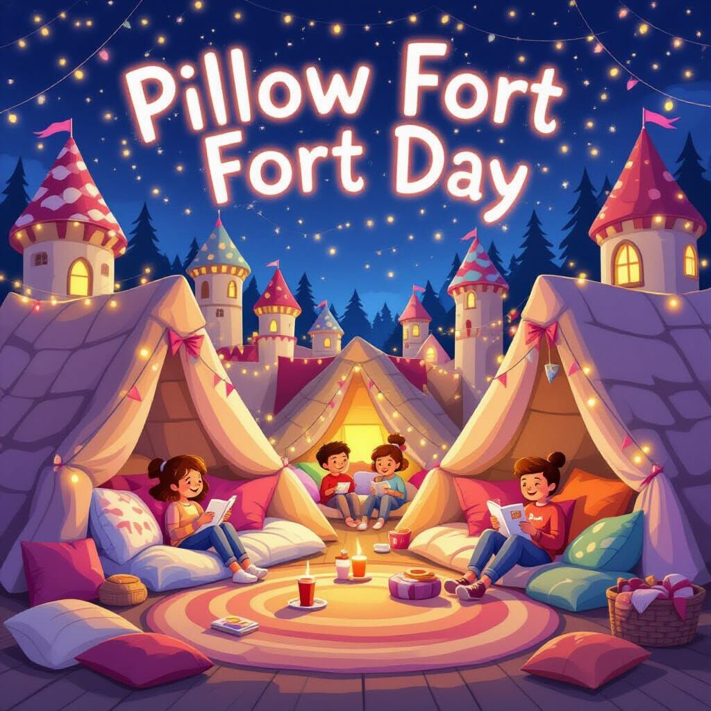 A cozy scene of families celebrating Pillow Fort Day with large pillow and blanket castles. Fairy lights, cushions, and fabrics create magical towers and tunnels in a warm, dreamlike atmosphere.