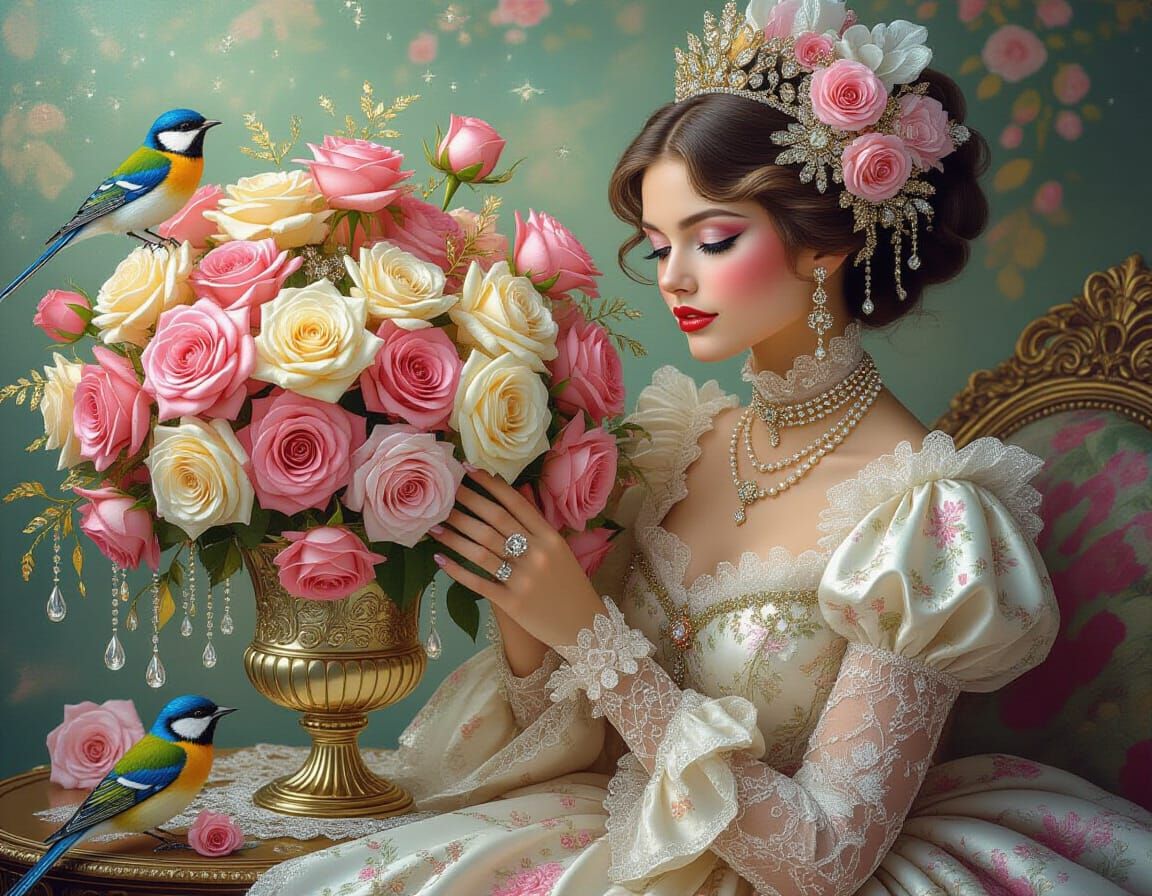 A radiant woman amidst jeweled roses and lace. The luxurious fantasy scene is rich with detail and soft, warm light. The image is rendered as a vibrant and detailed mixed media illustration.