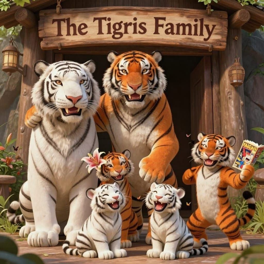 This image depicts a smiling tiger family outside their lair. A protective male, a maternal female, and playful cubs are featured with subtle floral and butterfly elements.