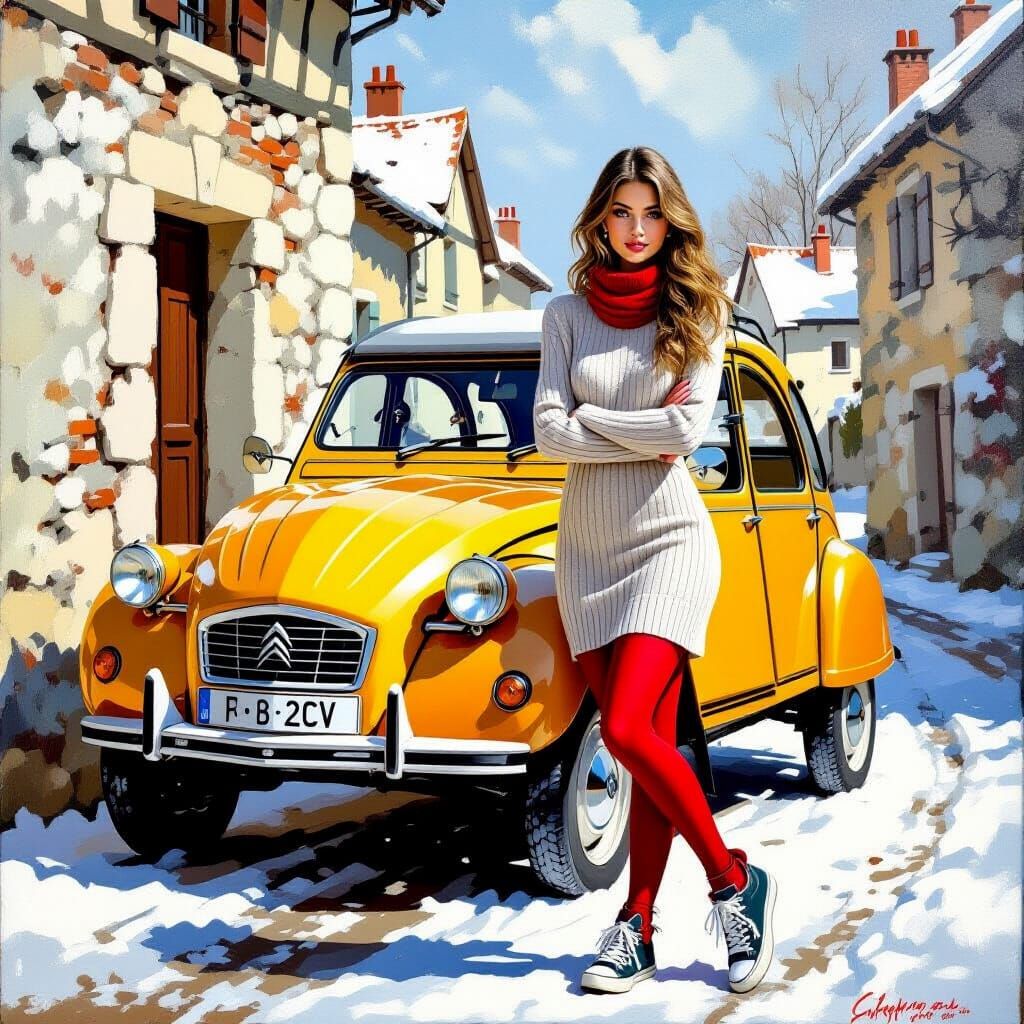 This image shows a stylish woman in a winter dress and red tights posing near a classic Citroen 2CV in a snowy French village. The scene is rendered as an oil painting.