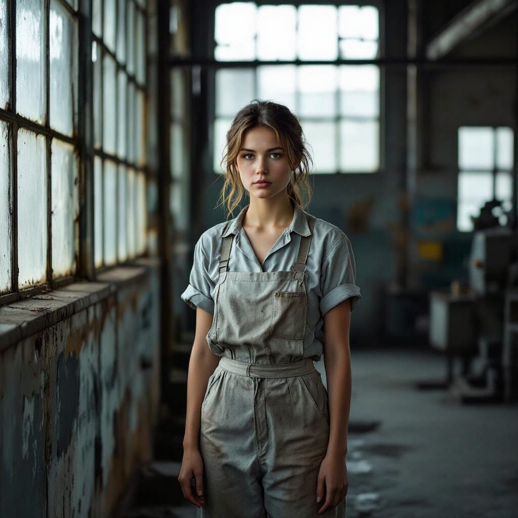 This photorealistic image shows a weary young woman in faded work clothes standing in an old factory. A grimy window casts dusty light on the desolate, industrial setting.